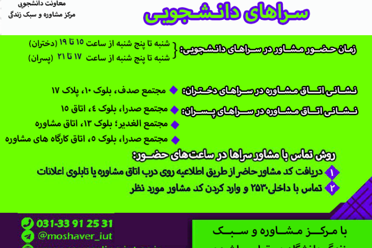 اطلاعیه توسعه واحد مشاوره در سراهای دانشجویی(حضوری و تلفنی)